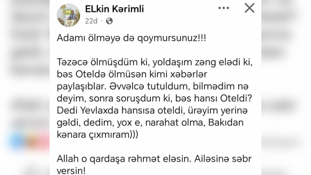 Bu gün öldüyü deyilən şair Elkin Kərimli haqqında yayılan xəbərlərə münasibət bildirib.