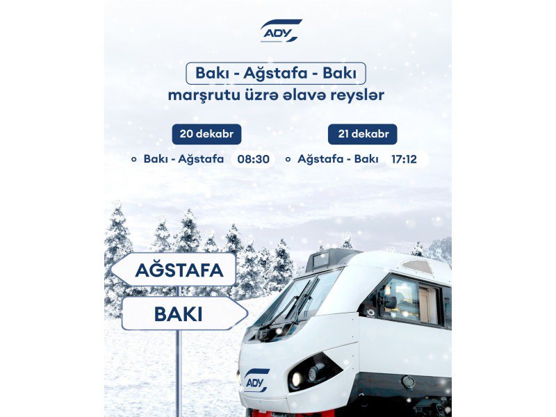 "Azərbaycan Dəmir Yolları" QSC (ADY) artan sərnişin tələbatını təmin etmək məqsədilə 20 və 21 dekabr tarixlərində Bakı-Ağstafa-Bakı istiqamətində əlavə qatar reysləri təyin edib.