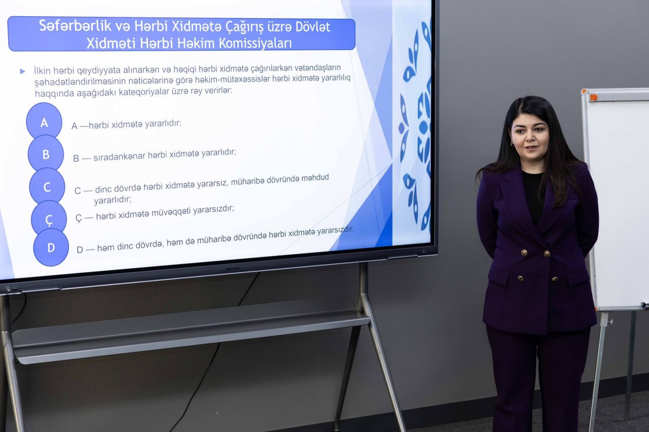 İştirakçılara müddətli həqiqi hərbi xidmətə çağırılan vətəndaşların tibbi şəhadətləndirilməsi prosesinin yekun tibbi müayinələri barədə ətraflı məlumat verilib. Onlara Tibbi Qiymətləndirmə Komissiyasının müayinə nəticələrinin kateqoriyalar üzrə təsdiqlənməsi mexanizmi izah olunub.