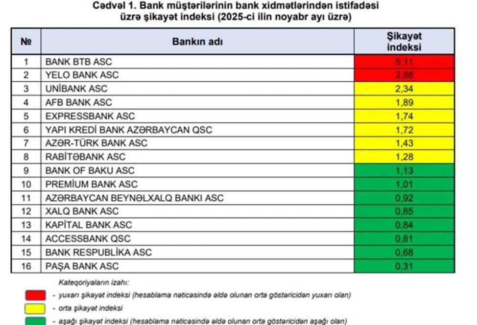 Bu ilin noyabr ayında barəsində ən çox şikayət edilən bank "Bank BTB" ASC olub. Bu bankdan şikayət indeksi 5.11-dir.