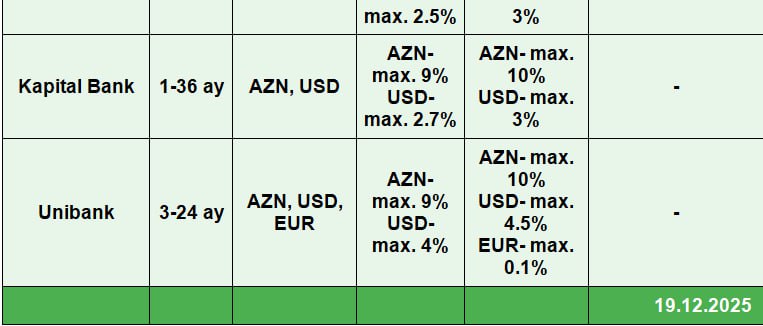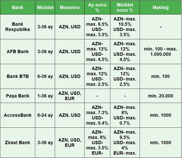 Aşağıdakı cədvəldə müddətli əmanətlər üzrə bankların təqdim etdiyi əsas şərtlər təqdim olunub: