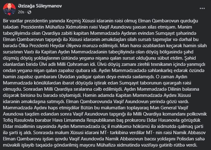 Bizim.Media xəbər verir ki, bunu Milli Qvardiyanın keçmiş komandiri, ehtiyatda olan polkovnik Əzizağa Süleymanov sosial şəbəkə hesabında yazıb.