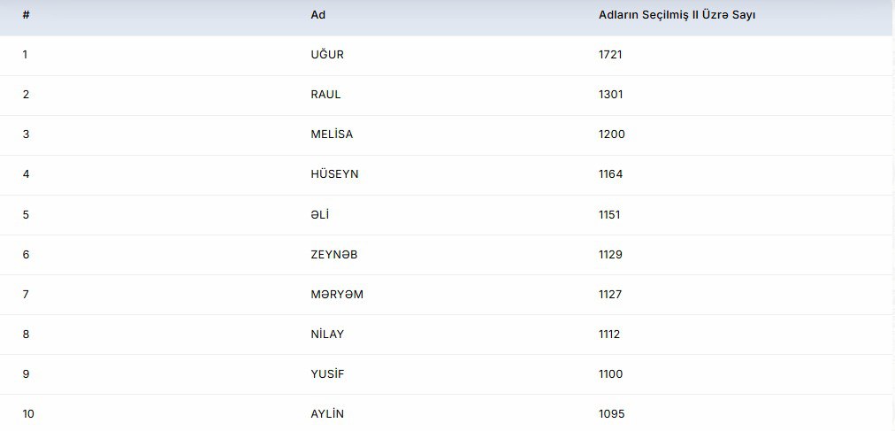 Bundan əlavə, yeni doğulmuş qızlardan 1129-na Zeynəb, 1127-nə Məryəm, 1112-nə Nilay, 1095-nə isə Aylin adı qoyulub.