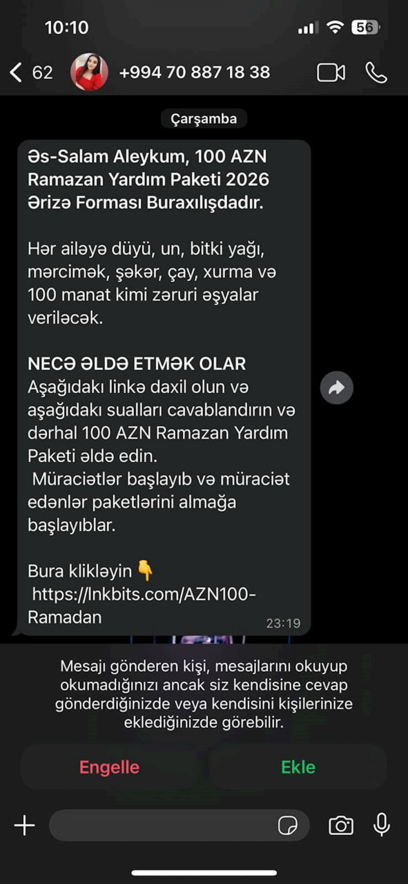 100 AZN Ramazan Yardım Paketi” adı altında yayılan bu tip mesajlar son günlər sosial şəbəkələrdə sürətlə yayılır. Mesajlarda vətəndaşlardan guya yardım almaq üçün linkə daxil olub məlumatlarını doldurmaları tələb olunur. İlk baxışda xeyriyyə məqsədli kimi təqdim edilən bu paylaşımlar əslində fırıldaqçılıq riski daşıyır. Mütəxəssislər xəbərdarlıq edir ki, naməlum linklərə daxil olmaq şəxsi məlumatların ələ keçirilməsinə səbəb ola bilər.