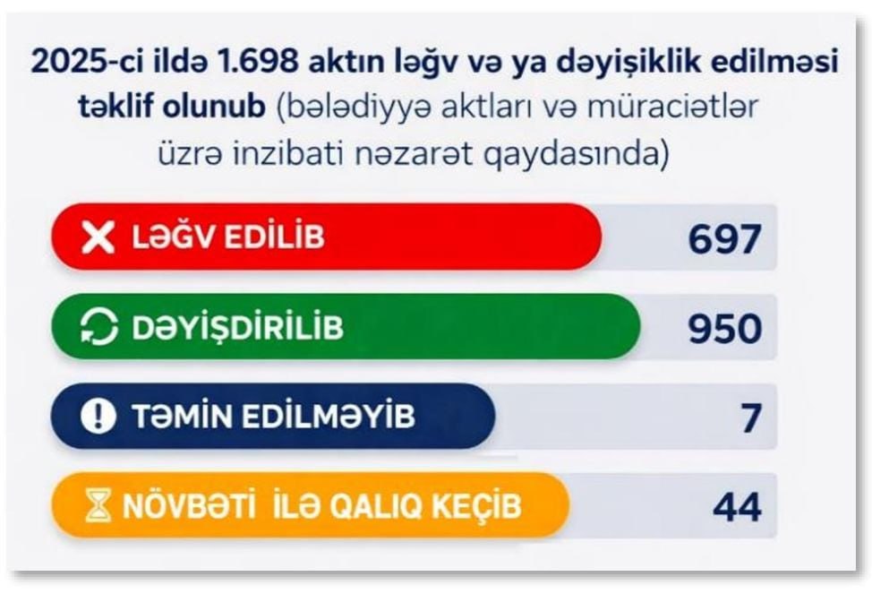 Normativ hüquqi aktların tələblərinə zidd olan 1645 (2%) aktın dəyişdirilməsi və ya ləğv edilməsi üçün aidiyyəti bələdiyyələrə təkliflər verilib, 618 akt (0,8%) isə baxılmaqdadır.