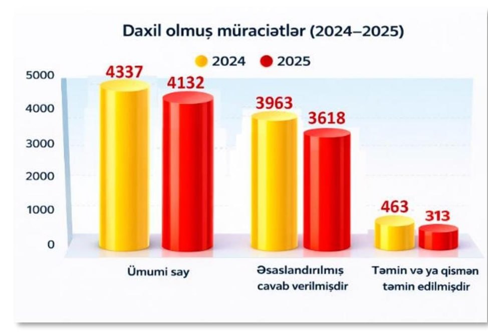 Bələdiyyələrin fəaliyyəti ilə bağlı daxil olmuş 4132 müraciətdən 3618-nə (87%) baxılıb, 204-ü (5%) aidiyyəti üzrə göndərilib, 310 (8%) müraciət isə növbəti ilə qalıq olaraq keçib.