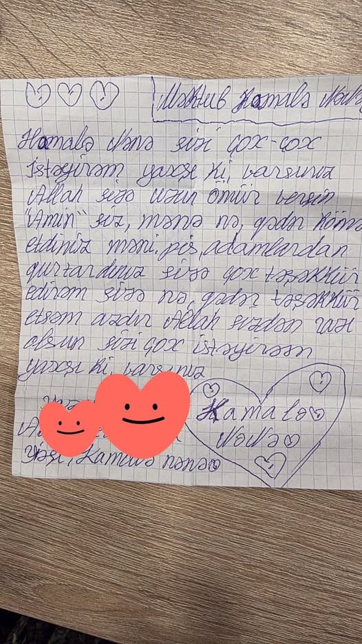 Birlik sədri azyaşlının xəstəxanada olarkən yazdığı məktubu da paylaşımda təqdim edib.