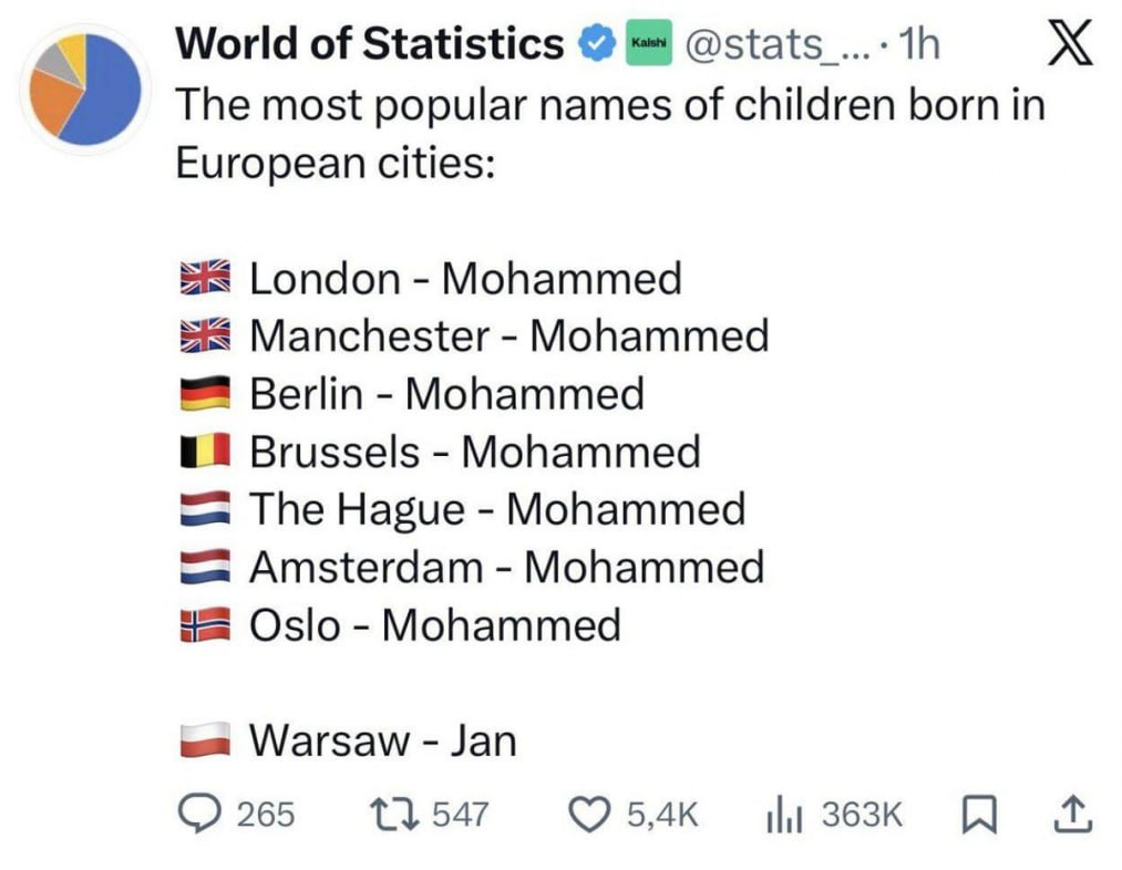 Portalın təqdim etdiyi statistikaya əsasən, “Məhəmməd” adı London, Mançester, Berlin, Brüssel, Haaqa, Amsterdam və Osloda yeni doğulan oğlanlara verilən adlar siyahısında birinci yeri tutur.