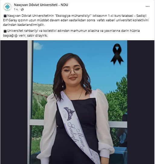Ekologiya mühəndisliyi ixtisasının 1-ci kurs tələbəsi Sadiqli Elif Gəray qızının uzunsürən xəstəlikdən vəfat etdiyi bildirilib.