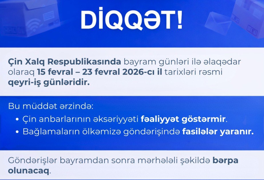 Hazırda oxunan: Çindən Azərbaycana sifarişi olanların DİQQƏTİNƏ! Fevralın 15-dən 23-dək...
