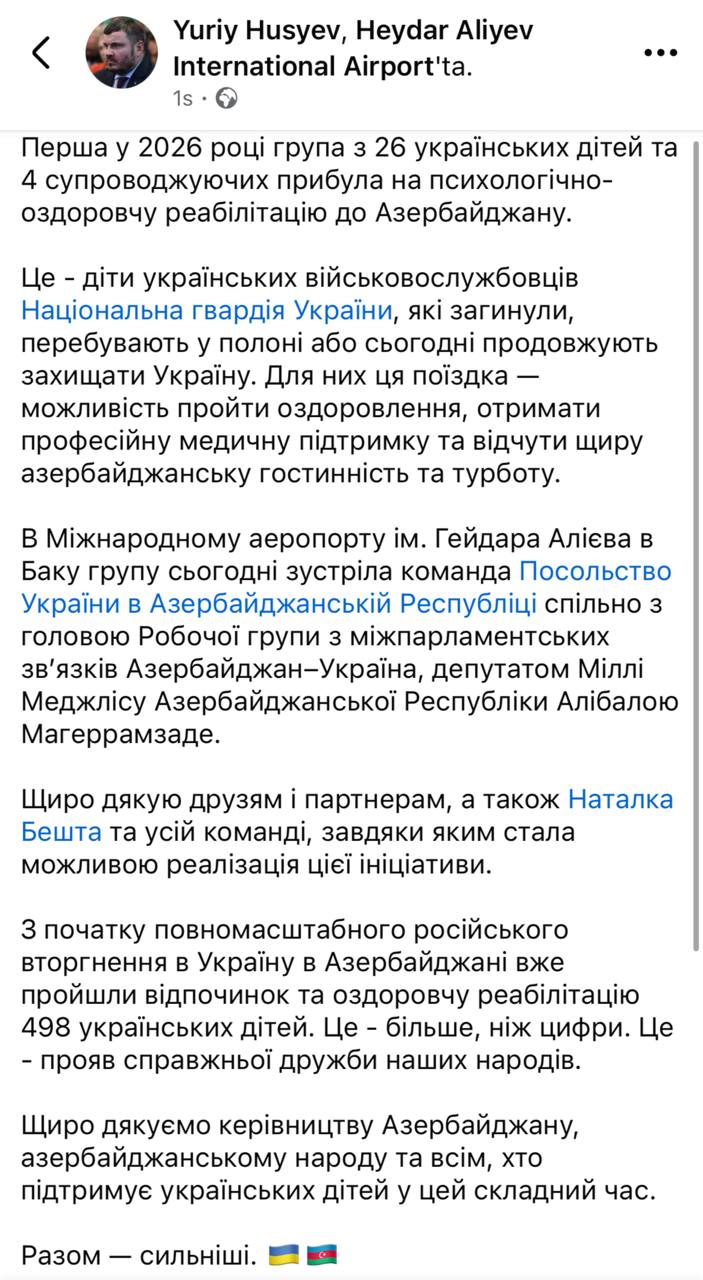 26 ukraynalı uşaq və 4 müşayiətçidən ibarət ilk qrup psixoloji-sağlamlıq reabilitasiyası üçün Azərbaycana gəlib.