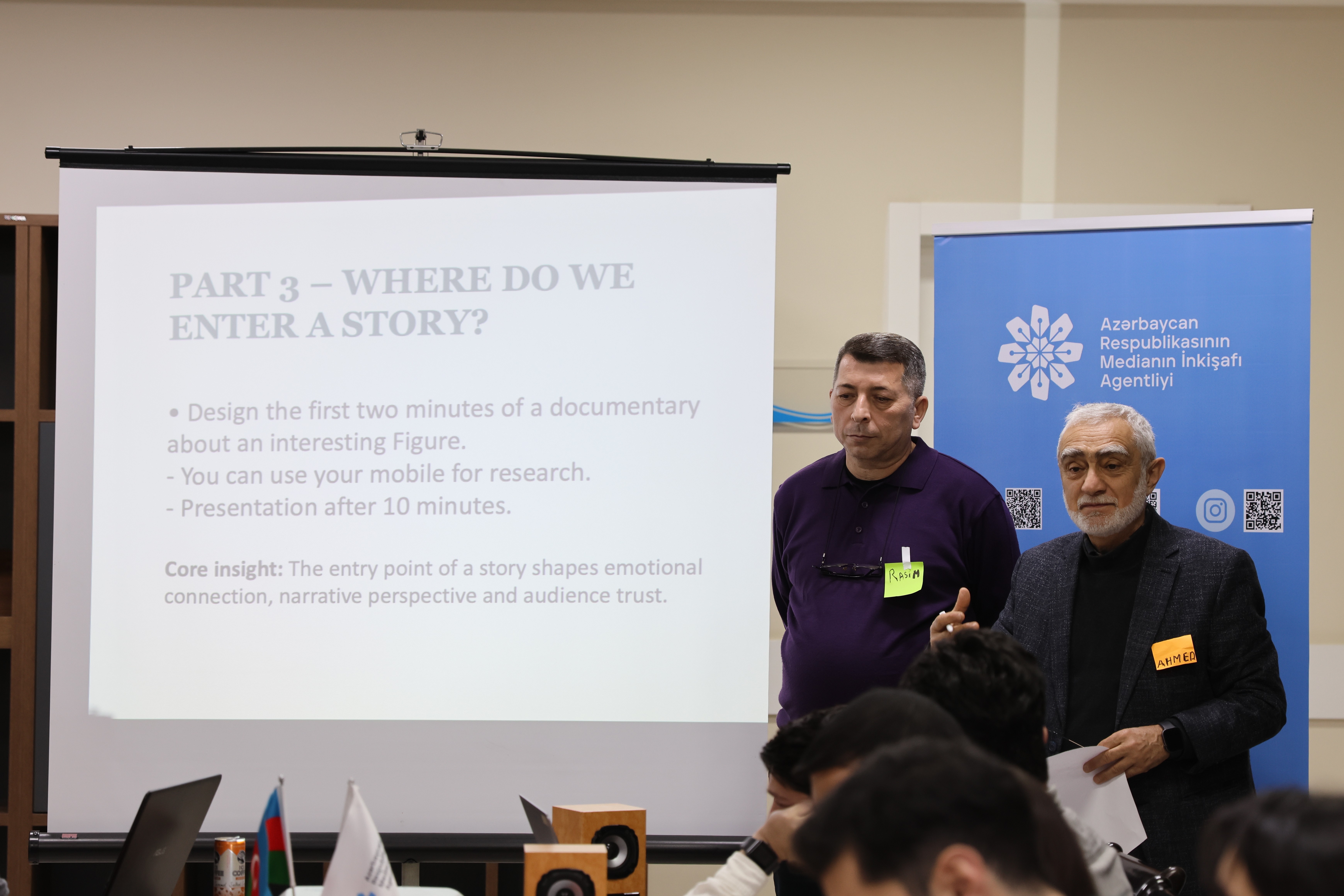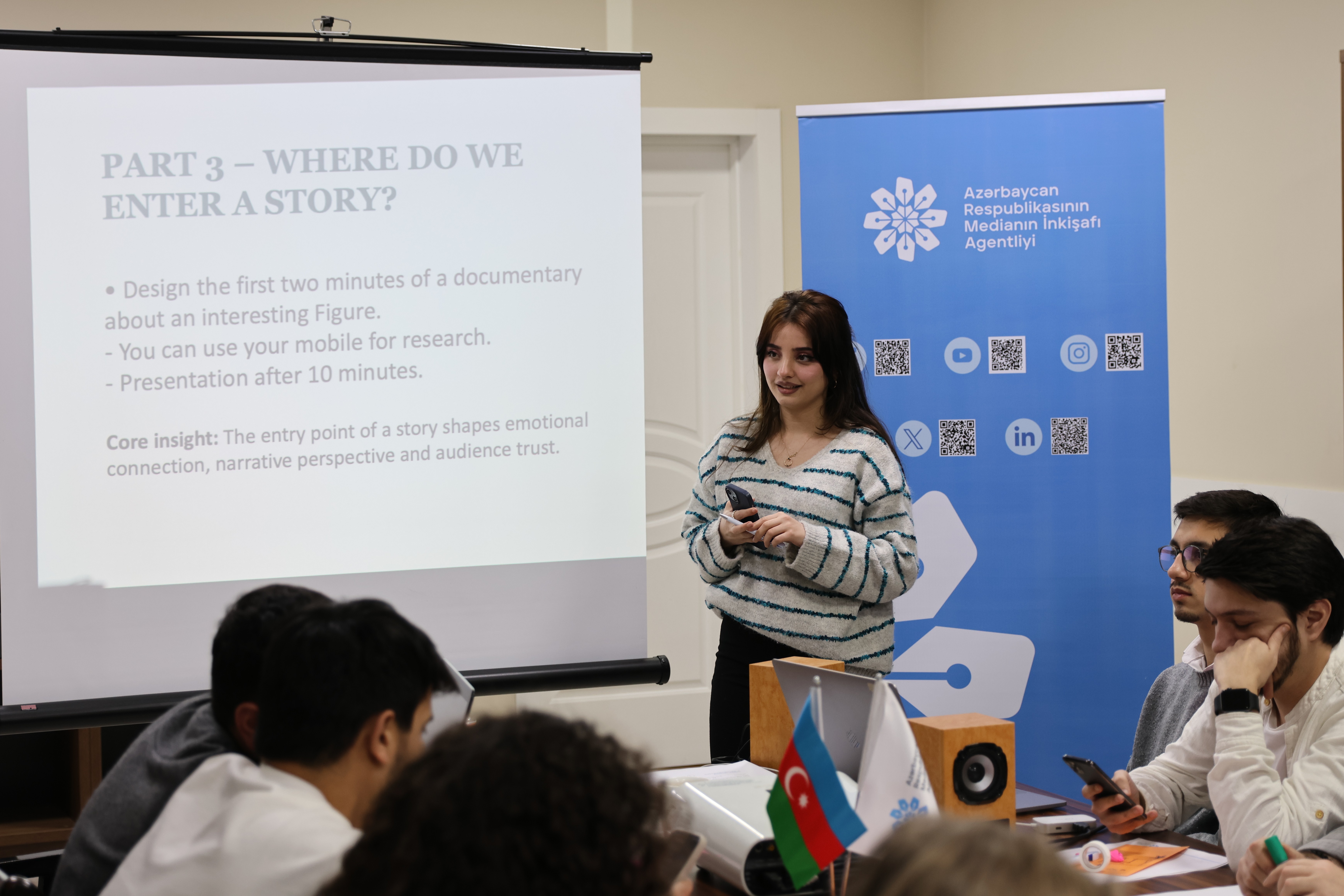 Sessiyalarda “Müasir multimedia məzmun yaradıcılığına giriş: təcrübə və fikir mübadiləsi”, “Real iş mühitində qərarvermə: peşə terminologiyası, montaj və vizual elementlərin işlənilməsi”, “Hekayəyə giriş: auditoriyanı cəlb edən giriş strategiyaları, emosiya və etibarlılıq”, “Avadanlıqlardan istifadə: kadrlama və perspektivin gücü”, “Vizual materiallarda emosional təsir və etik yanaşma”, eləcə də “Vizual hekayəçilikdə refleksiya və əsas nəticələr” mövzuları müzakirə olunub.