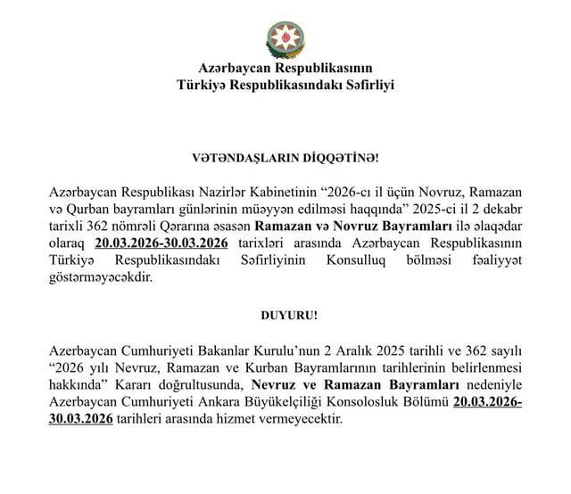 Azərbaycanın Türkiyədəki səfirliyi on gün konsulluq xidməti göstərməyəcək.