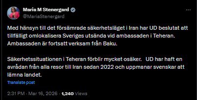 Səfirlik Bakıda işini davam etdirir. Tehranda təhlükəsizliklə bağlı vəziyyət son dərəcə qeyri-müəyyən olaraq qalır. İsveçin Xarici İşlər Nazirliyi 2022-ci ildən İrana istənilən səfərlərdən çəkinməyi tövsiyə edir və İsveç vətəndaşlarını ölkəni tərk etməyə çağırır", - nazir qeyd edib.