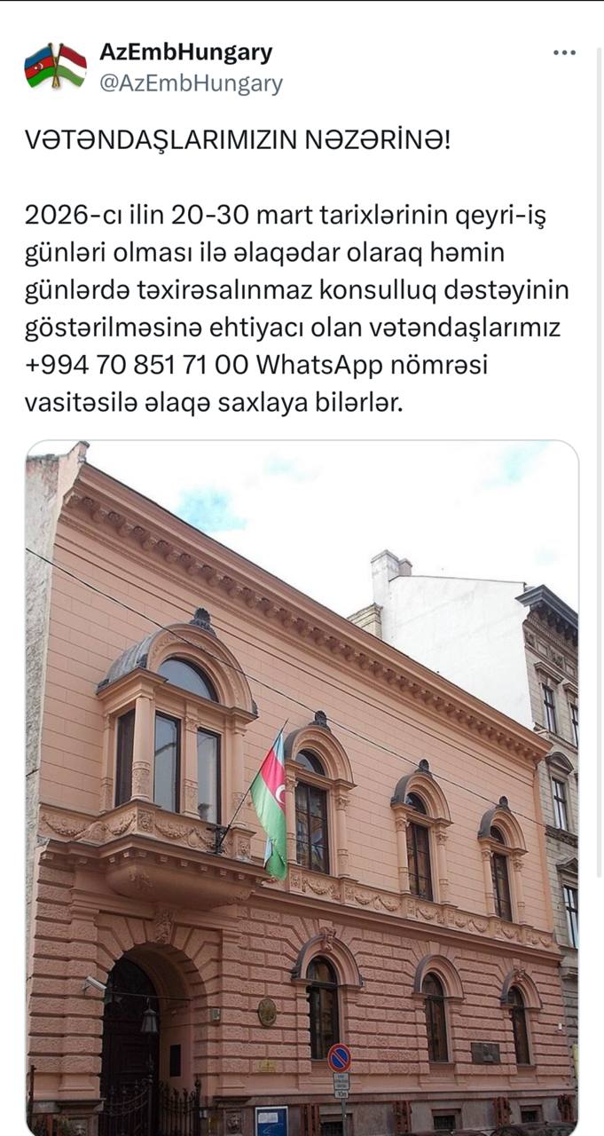 Azərbaycanın Macarıstandakı səfirliyi 2026-cı ilin 20-30 mart tarixlərinin qeyri-iş günləri olması ilə əlaqədar olaraq təxirəsalınmaz konsulluq dəstəyi göstərəcək.