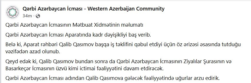 Qərbi Azərbaycan İcması Aparatında kadr dəyişikliyi baş verib.