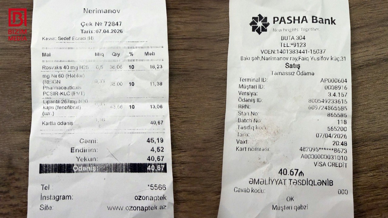 Bizim.Media-ya müraciət edən müştəri bildirib ki, sözügedən aptekdən təxminən 40 manatlıq dərman vasitəsi alıb.