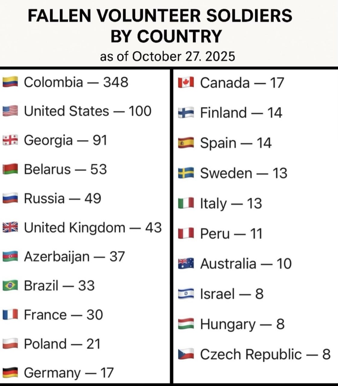 27 oktyabr 2025-ci il tarixinə olan məlumata əsasən, Ukrayna üçün canlarından keçən əcnəbi könüllülər arasında 65 ölkənin vətəndaşları var.