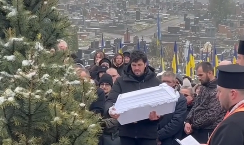 Ukraynanın Ternopol şəhərində Rusiyanın bombardmanı nəticəsində həlak olan uşağının cənazəsi ilə vidalaşan ata tabutu qucağında beşik kimi yelləyib.