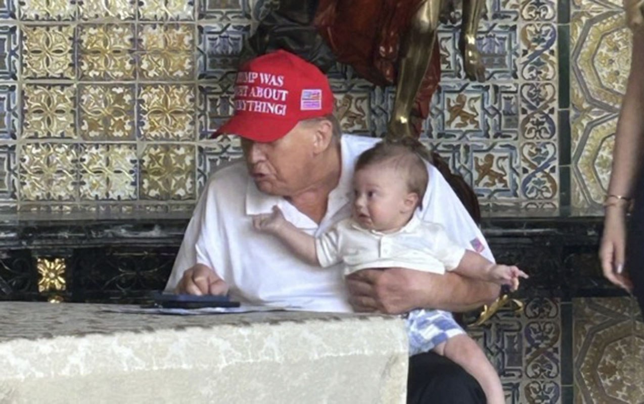 Fotoda Tramp nəvəsi Aleksandrı qucağına alıb.