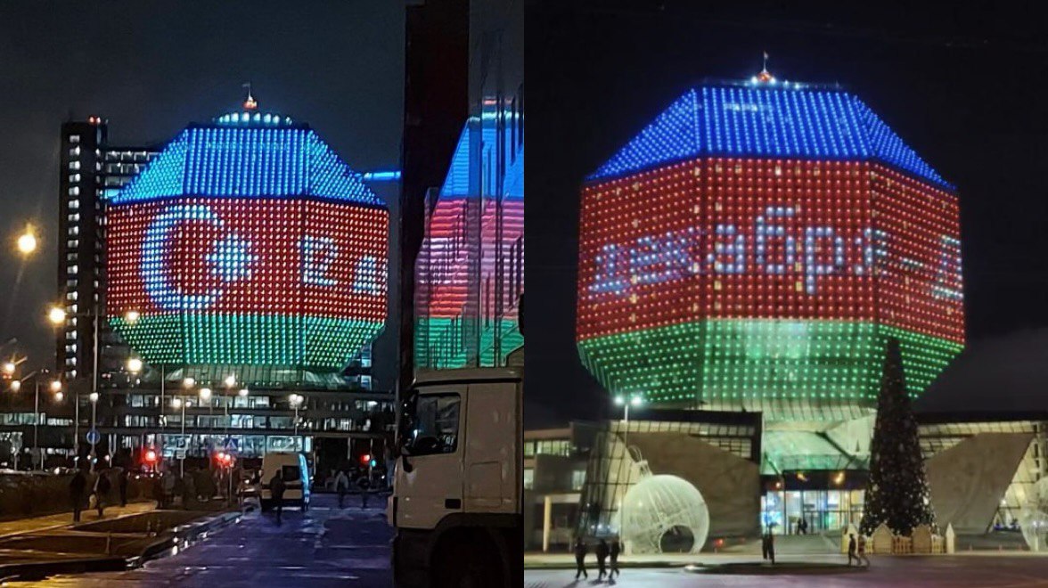 Belarusun paytaxtı Minsk şəhərinin əsas rəmzlərindən biri olan Milli Kitabxananın binası Azərbaycan Dövlət Bayrağının rəngləri ilə işıqlandırılıb.