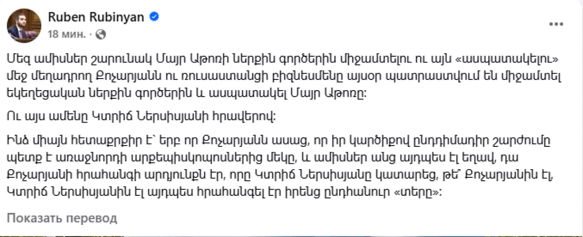 “Və bütün bunlar — Ktriç Nersisyanın dəvəti ilə. Məni yalnız bir məsələ maraqlandırır: Köçəryan bəyan edəndə ki, müxalifət hərəkatına arxiyepiskoplardan biri rəhbərlik etməlidir və bir neçə ay sonra məhz bu cür də baş Verdi. Bu, Köçəryanın göstərişinin Ktriç Nersisyan tərəfindən icrası idi, yoxsa həm Köçəryana, həm də Ktriç Nersisyana bu göstərişi onların ortaq “sahibi” verib?”, — deyə Ruben Rubinyan qeyd edib.