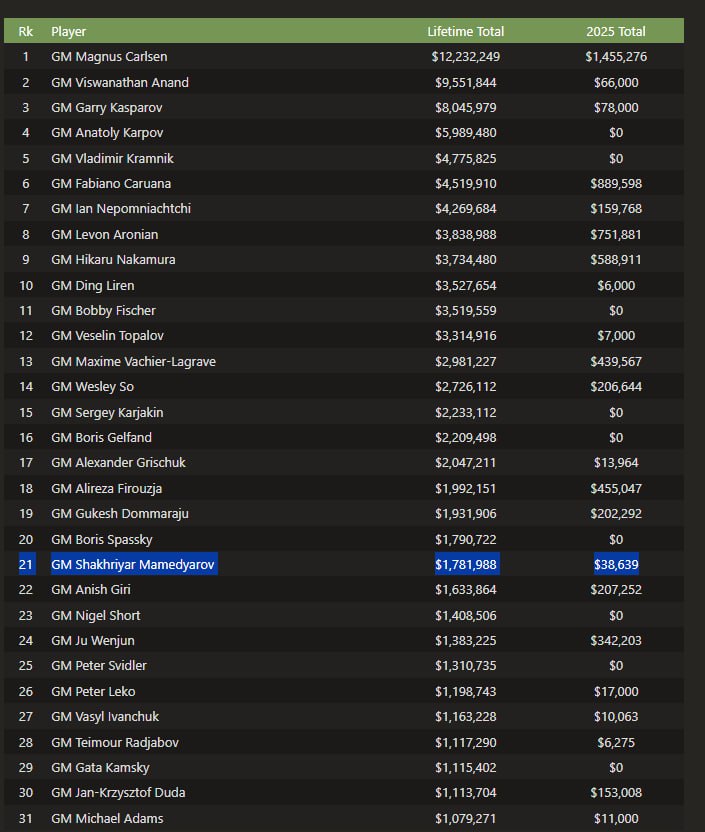 Siyahının 21-ci sırasında olan qrosmeyster Şəhriyar Məmmədyarov ümumillikdə 1 milyon 781 min 988 dollar (3,030,000 AZN), 2025-ci ildə isə 38 min 639 dollar (65.686,30 AZN) mükafat qazanıb.