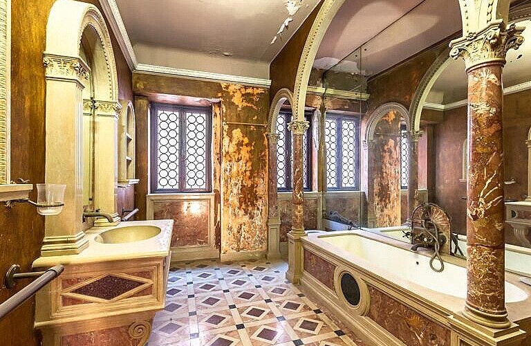 Sarayın interyeri dəbdəbəsi ilə seçilir: 9 yataq otağı, sütunlu 8 vanna otağı, freskalarla bəzədilmiş mərasim zalları, Murano çilçıraqları, kitabxana, bağ, şəxsi körpü və kanala açılan terras mövcuddur. (Musavat.com)