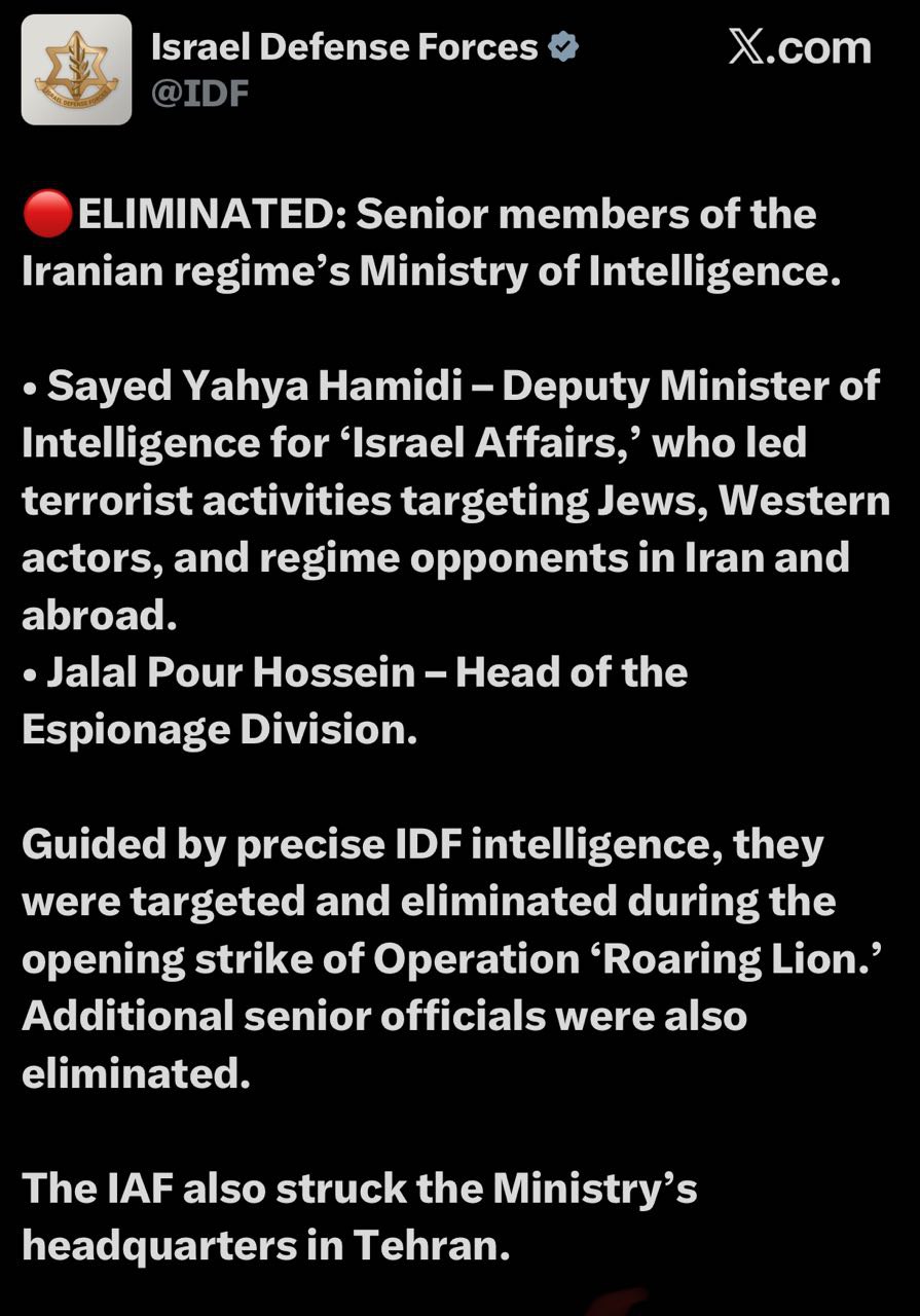 “Aslan nəriltisi əməliyyatı çərçivəsində İsrail hərbçiləri İran Kəşfiyyat Nazirliyi-nin obyektlərinə zərbələr endiriblər. Nəticədə nazir müavini Seyid Yəhya Həmidi və casusluq idarəsinin rəhbəri Cəlal Pur Hüseyn də daxil olmaqla bir neçə yüksək vəzifəli əməkdaş öldürülüb”, - deyə məlumatda qeyd olunub.