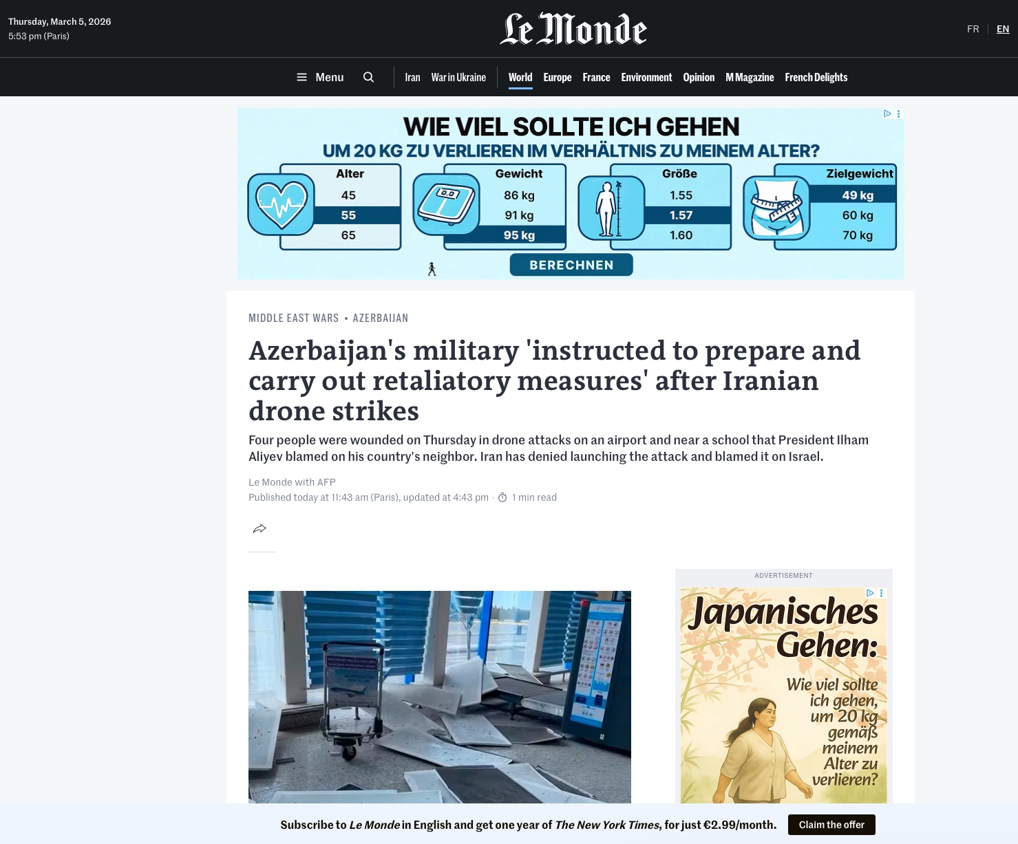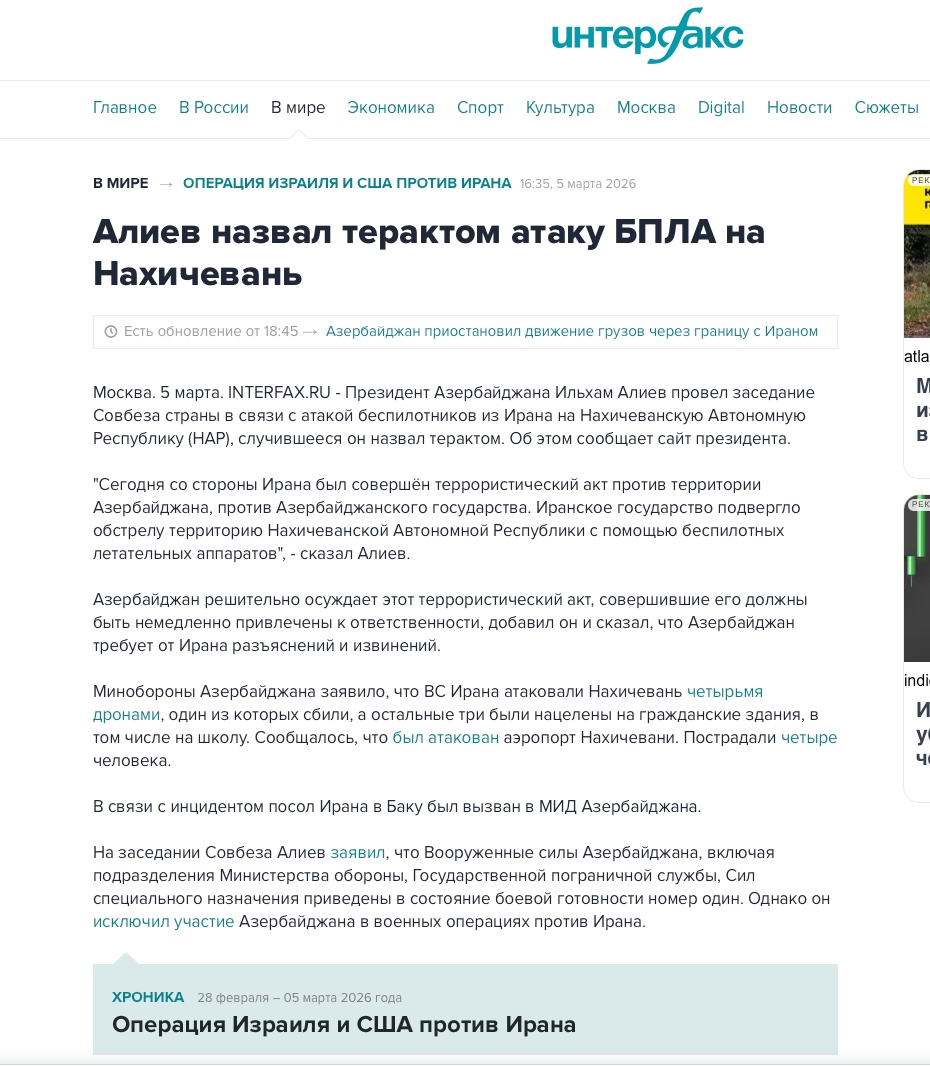Nəşr qeyd edir ki, pilotsuz uçuş aparatlarından biri Azərbaycan ərazisində yerləşən obyektlərdən birinə düşüb və hadisə nəticəsində bir neçə nəfər yaralanıb. Məqalədə Prezident İlham Əliyevin bu hadisənin ciddi təhlükəsizlik insidenti olduğunu bildirdiyi və İranın məsuliyyət daşımalı olduğunu vurğuladığı qeyd edilir.