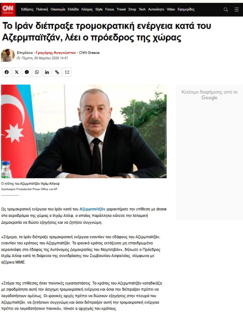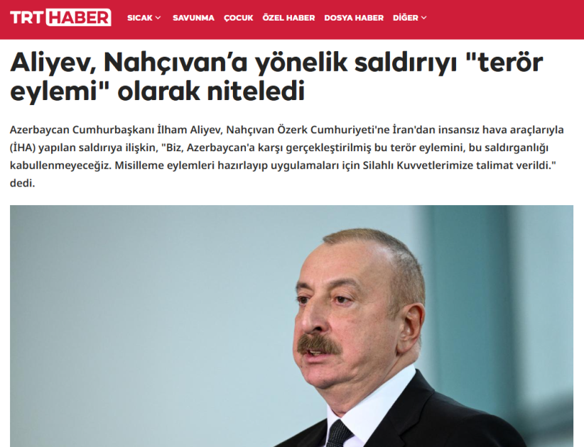 Yunanıstanın dövlət televiziya və xəbər platforması "ERT News" yazır ki, Prezident İlham Əliyev Azərbaycanın ərazisinə edilən dron hücumunu İran tərəfindən həyata keçirilmiş terror aktı kimi qiymətləndirib.