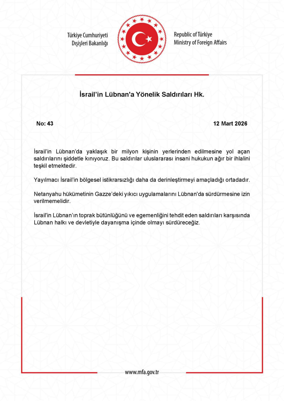 Türkiyənin Xarici İşlər Nazirliyi (XİN) İsrailin Livana hücumlarını pisləyib.