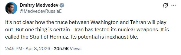 Bizim.Media xəbər verir ki, bu sözləri Rusiya Federasiyası Təhlükəsizlik Şurasının sədr müavini Dmitri Medvedev “X” hesabında yazıb.