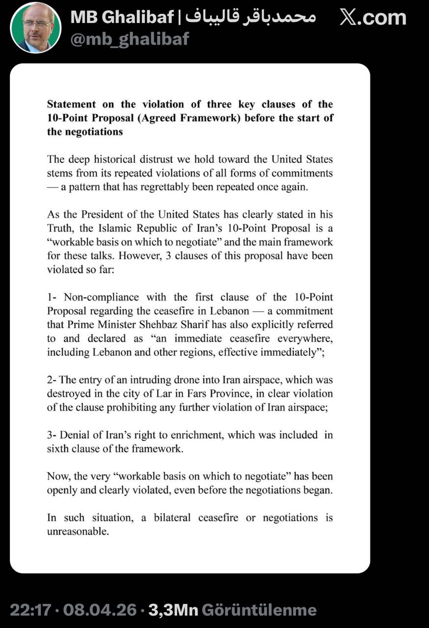"Beləliklə, danışıqlar üçün əsasın özü hələ onlar başlamazdan əvvəl açıq və aşkar şəkildə pozulub. Belə bir vəziyyətdə ikitərəfli atəşkəs və ya danışıqlar məqsədəuyğun deyil", - Qalibaf yekunlaşdırıb.