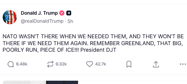 “NATO bizə ehtiyac duyduğumuz zaman yanımızda deyildi və yenə ehtiyacımız olarsa, olmayacaq. Qrenlandiyanı xatırla, o böyük, pis idarə olunan buz parçasını!!!”, – Prezident bildirib.