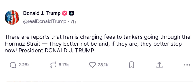 "İranın Hörmüz boğazından keçən tankerlərdən ödəniş aldığı barədə məlumatlar var. Əgər belə olmasaydı, daha yaxşı olardı. Əgər belədirsə, indi dayandırmaları daha yaxşı olar", - Tramp qeyd edib.