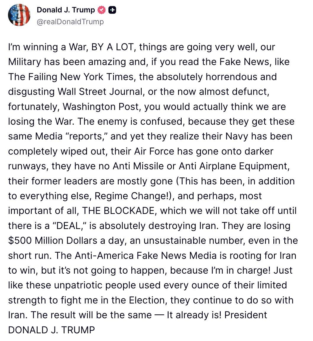 Tramp, həmçinin medianın yaydığı məlumatların əksinə olaraq, ABŞ-nin hərbi sahədə ciddi irəliləyişlər əldə etdiyini bildirib: “Mən müharibədə böyük fərqlə qalib gəlirəm, işlər çox yaxşı gedir, ordumuz inanılmaz nəticələr göstərir”.