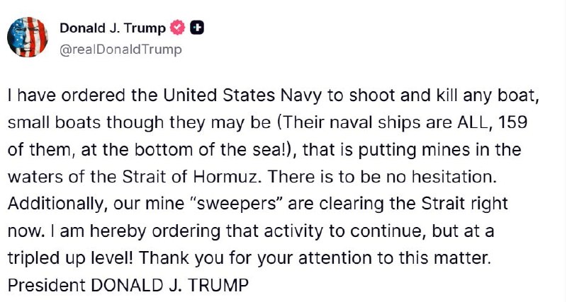 “Mən ABŞ Hərbi Dəniz Qüvvələrinə əmr etmişəm ki, Hörmüz boğazının sularına mina yerləşdirən istənilən qayığı – kiçik qayıq olsa belə (onların bütün 159 hərbi gəmisi artıq dənizin dibindədir!) – dərhal vurub məhv etsinlər”.