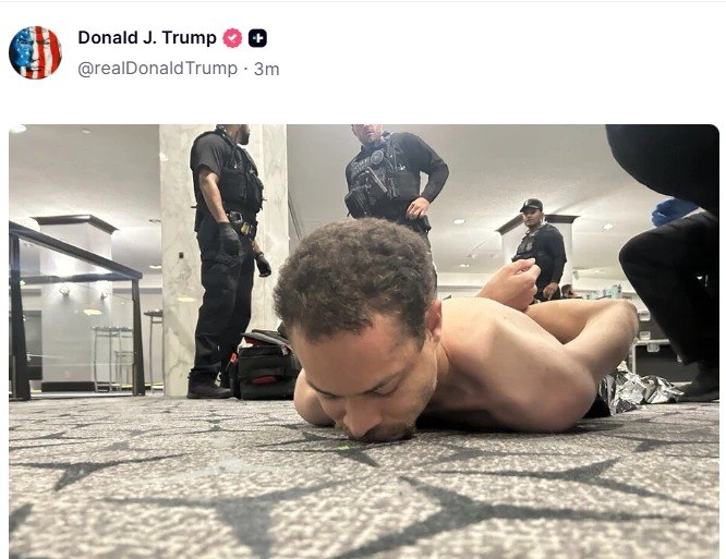 Trampın yayımladığı fotolarda üst geyimi olmayan kişinin yerdə uzandığı, əllərinin isə arxadan bağlandığı görünür.