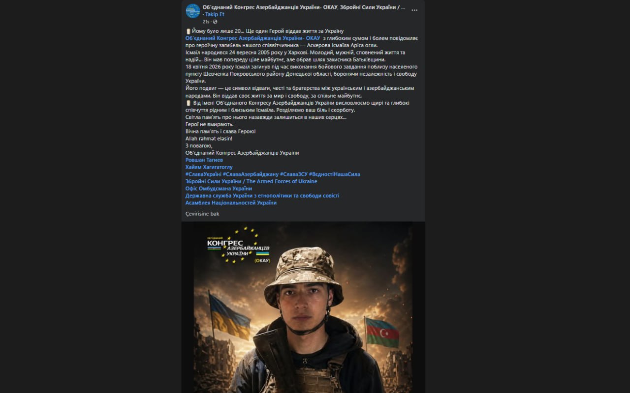 Bizim.Media xəbər verir ki, bu barədə Ukrayna Azərbaycanlılarının Birləşmiş Konqresinin “facebook” səhifəsində paylaşım edilib.