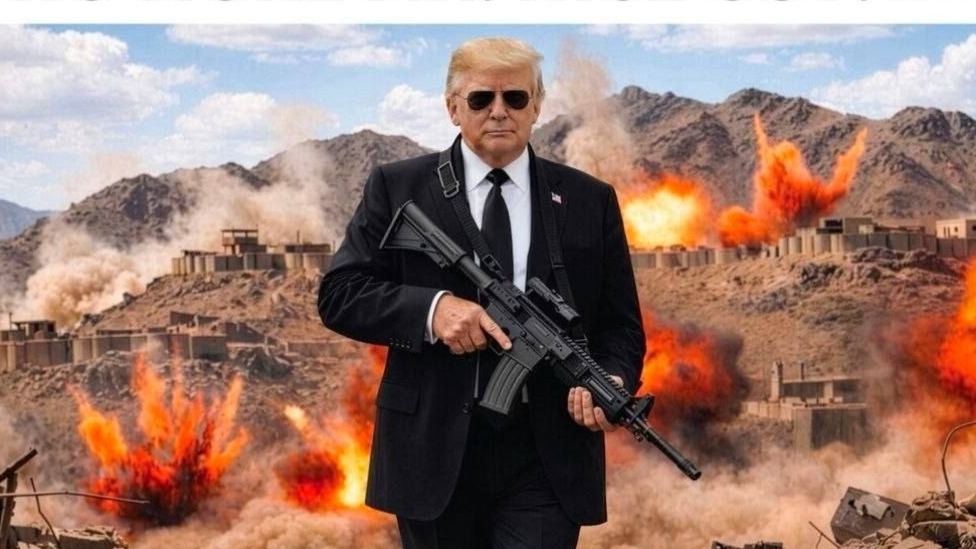 Paylaşımda Tramp hərbi əməliyyatlar fonunda əlində silah olan fotosunu paylaşaraq "No more Mr. Nice Guy!" (yaxşı oğlan olmaq dövrü bitdi) sözlərini yazıb.
