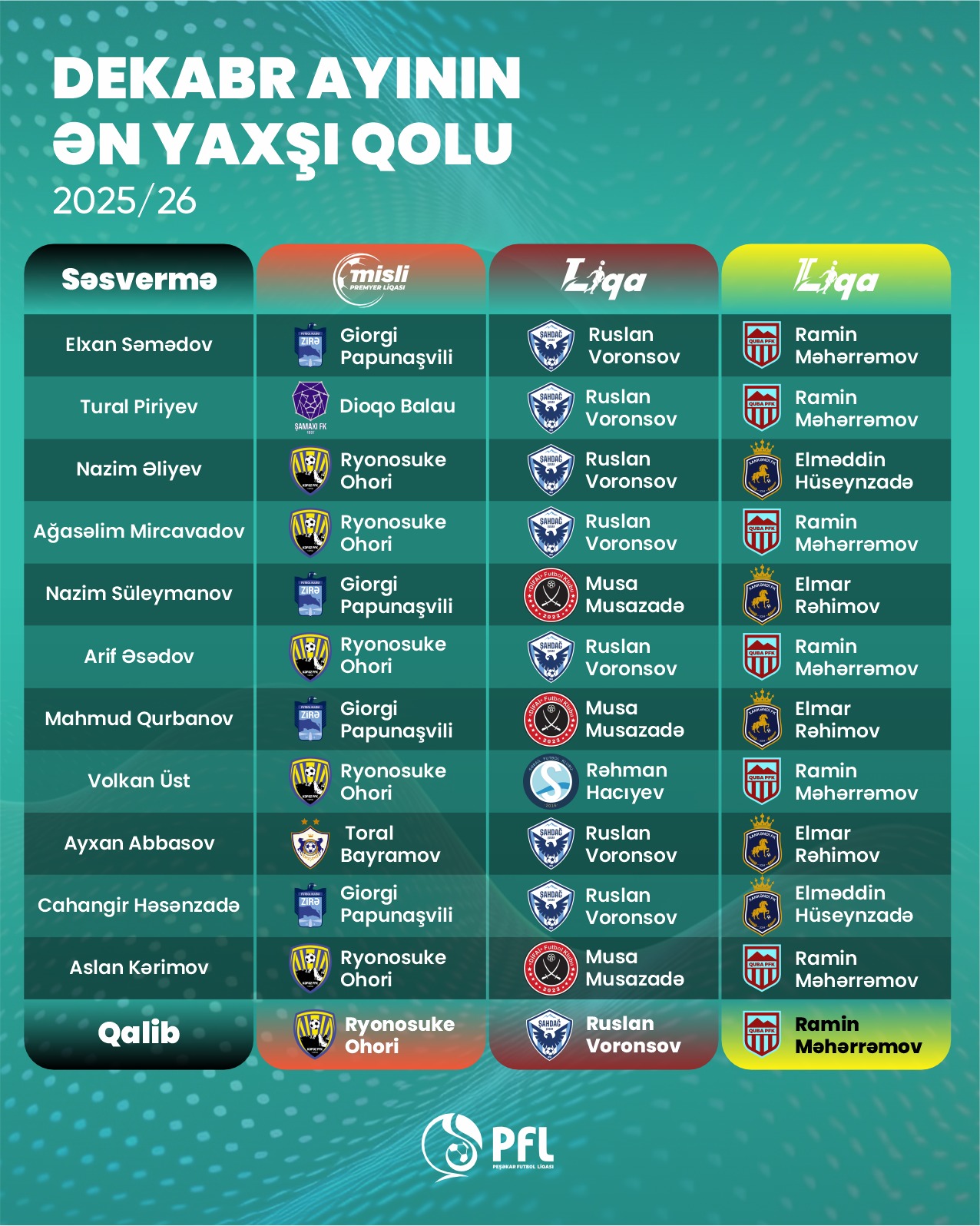 Bizim.Media Peşəkar Futbol Liqasına istinadən xəbər verir ki, Misli Premyer Liqasında ən yaxşı qolun müəllifi "Kəpəz"in yaponiyalı legioneri Ryonosuke Ohori olub.