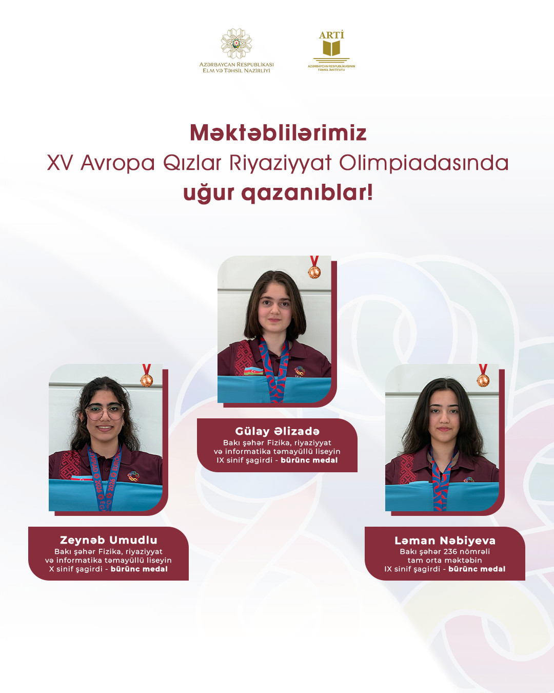 Fransanın Bordo şəhərində keçirilən olimpiadada Bakı şəhəri Fizika, riyaziyyat və informatika təmayüllü liseyin 9-cu və 10-cu sinif şagirdləri Gülay Əlizadə və Zeynəb Umudlu, həmçinin Bakı şəhəri 236 nömrəli tam orta məktəbin 9-cu sinif şagirdi Ləman Nəbiyeva fərqləniblər.