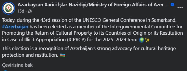 Bu gün Səmərqənddə keçirilən UNESCO-nun Baş Konfransının 43-cü sessiyasında Azərbaycan 2025–2029-cu illər üçün “Mənşə ölkələrinə mədəni əmlakın qaytarılmasının və ya qanunsuz mənimsənildiyi hallarda onun bərpasının təşviqi üzrə Hökumətlərarası Komitə”yə (ICPRCP) üzv seçilib.
