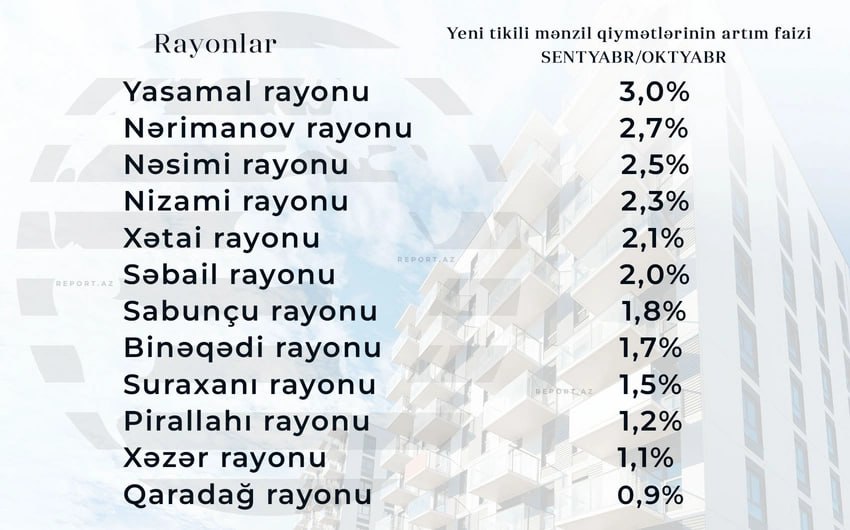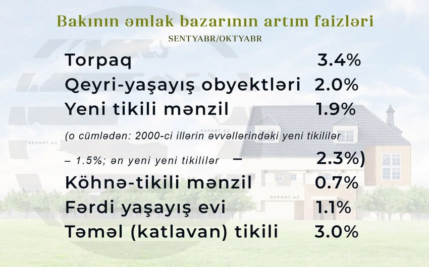 "Oktyabr ayında torpaq sahələrinin qiyməti 3,4 %, qeyri-yaşayış obyektlərinin qiyməti isə 2 % artıb. Yeni tikili mənzillərdə ümumi artım 1,9 % təşkil edib. 2000-ci illərin əvvəllərində tikilmiş binalarda qiymətlər 1,5 %, ən yeni tikililərdə isə 2,3 % yüksəlib. Köhnə tikililərdə artım 0,7 %, fərdi yaşayış evlərində 1,1 %, təməl mərhələsində (kotlovan) olan layihələrdə isə 3 % olub", – deyə ekspert vurğulayıb.