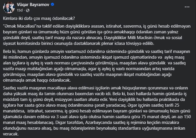 Əgər işçinin saatlıq tarifi 25 manatdırsa, istirahət, səsvermə, iş günü hesab edilməyən bayram günləri və ümumxalq hüzn günü işləməkdə davam edibsə və 3 saat əlavə işdə olubsa həmin saatlara görə 75 manat deyil, ən azı 150 manat maaş hesablanacaq. Digər tərəfdən, Azərbaycanda saatlıq iş rejiminə keçidin müzakirə olunduğunu nəzərə alsaq, bu maaş ödənişlərinin beynəlxalq standartlara uyğunlaşmasına imkan verəcək.