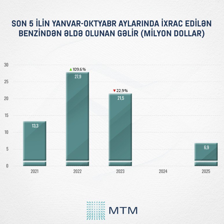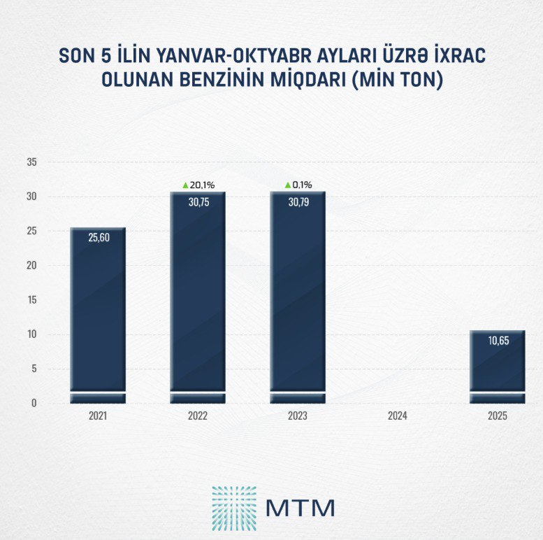 Media Təhlil Mərkəzinin (MTM) Dövlət Statistika Komitəsinin açıqladığı rəsmi məlumatlar əsasında apardığı təhlilə görə, 2025-ci ilin yanvar–oktyabr aylarında Azərbaycandan 10,65 min ton benzin ixrac olunub.