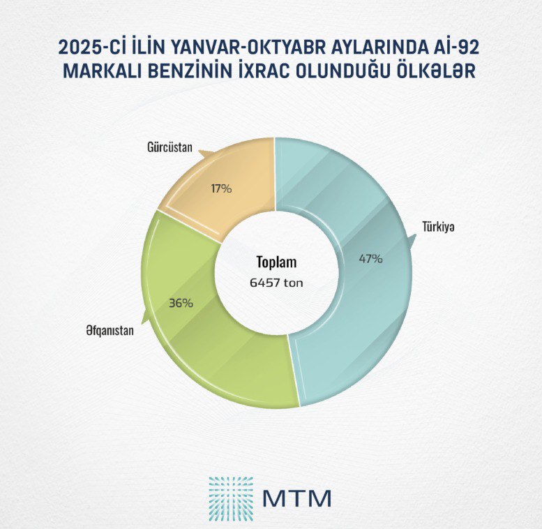 Aparılan təhlilə əsasən, ölkə üzrə ixracda ən böyük pay Aİ-92 markalı benzinin payına düşür. 2025-ci ilin yanvar–oktyabr aylarında ümumilikdə 6 457 ton Aİ-92 markalı benzin ixrac olunub və bu ixrac Türkiyə, Əfqanıstan və Gürcüstan istiqamətində həyata keçirilib.