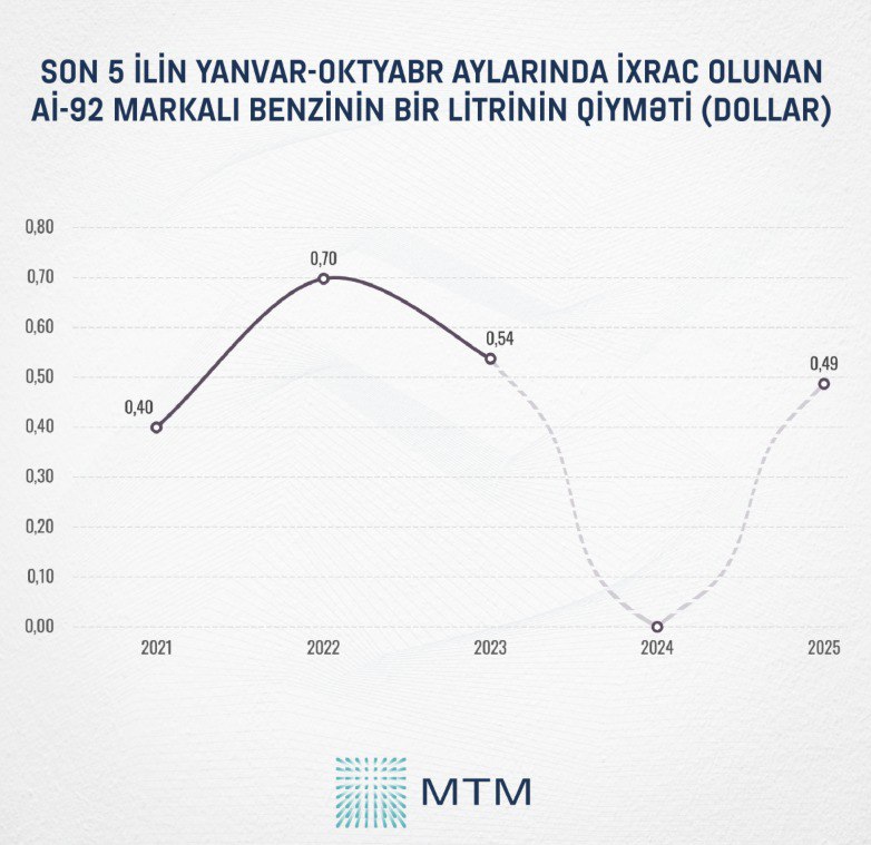 Rəsmi məlumatlara əsasən, 2021-ci ilin yanvar–oktyabr aylarında ixrac olunan Aİ-92 markalı benzinin bir litrinin orta qiyməti 0,4 ABŞ dolları təşkil edib. 2022-ci ilin eyni dövründə bu göstərici 0,7 ABŞ dollarına yüksəlib ki, bu da əvvəlki illə müqayisədə 0,3 ABŞ dolları və ya 74,4% artım deməkdir. 2023-cü ildə Aİ-92 markalı benzinin litrinin qiyməti 23% və ya 0,16 ABŞ dolları azalaraq 0,54 ABŞ dolları səviyyəsində qeydə alınıb. Cari ildə isə ixrac olunan Aİ-92 markalı benzinin bir litrinin orta qiyməti 0,49 ABŞ dolları olub.
