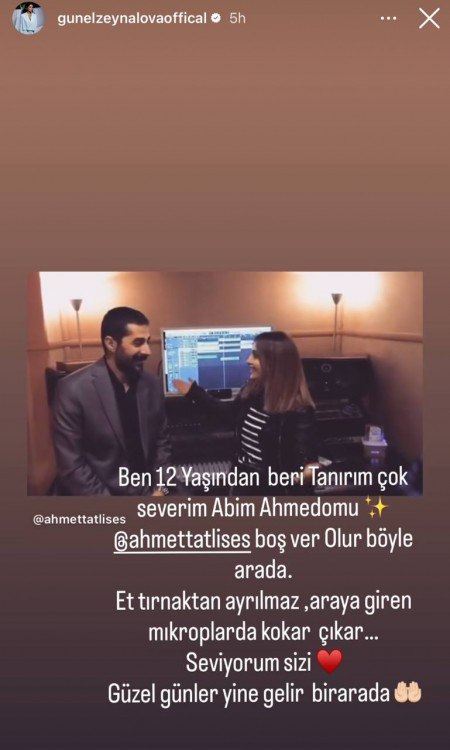 "12 yaşımdan bu yana Ahmedi tanıyıram və çox sevirəm. Boş ver, arada belə hallar olur. Ət dırnaqdan ayrılmaz, araya girən mikroblar da iylənib çıxar. Sizi sevirəm. Gözəl günlər yenə gələr".